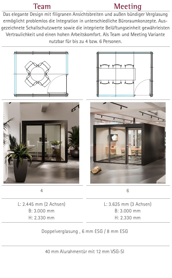 Unsere Raum-in-Raum-Systeme lassen sich in vielen unterschiedlichen Varianten ausführen. Die vier Grundtypen (Micro, Dialog, Team und Meeting) sind mit Einfachverglasung und in verschiedenen Farbvarianten realisierbar. Für erhöhte Schallschutzanforderungen kann zum Beispiel das doppelt verglaste System Kubus II eingesetzt werden. Ebenso können die Farben der Profile, Stoffe und der Wandelemente individuell kombiniert werden. Wir beraten Sie gerne über die vielen Möglichkeiten!